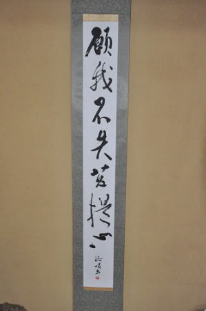 そこの床の間の掛け軸は住職(父)が不定期に掛け替えるんですけど、たまたま、その言葉が掛かってますね。これは実は僕が書道を習っていたころに書いたもの。恥ずかしいからやめてほしいんですけどね。決してこのインタビューに合わせて出したんじゃなくて、本当にたまたまですよ(汗)。